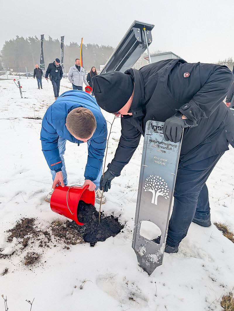 Schritt 1: Gemeinsam pflanzen Bei der Abholung Ihres neuen Fliegl-Fahrzeugs pflanzen wir gemeinsam mit Ihnen einen Baum auf unserem Gelände in Werk 2, Triptis. Die Teilnahme ist freiwillig.