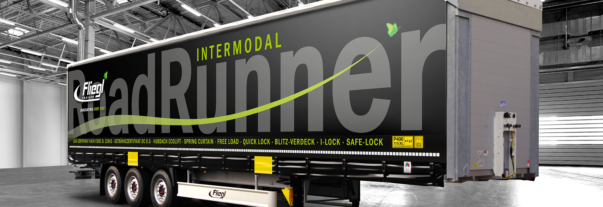 Zejména v přeshraniční dopravě může být železniční přeprava přívěsů alternativou k silniční dopravě. Třínápravový závěsný návěs Fliegl typu SDS 390 RoadRunner je proto nyní k dispozici ve verzi pro nakládku po železnici nebo kombinovanou dopravu (CT). Pro tento účel byl RoadRunner INTERMODAL odpovídajícím způsobem vybaven: kromě povinných úchopových hran je k dispozici stabilní nástavba, speciální plachta a sklopná ochrana proti podjetí a bočnímu nárazu. Opěrné nohy přívěsu byly posunuty o 120 milimetrů dozadu. Nápravy jsou odlehčené v souladu s normou 44 t. Nápravy jsou mírně posunuté v souladu se zatížením 44 t v kombinované dopravě.