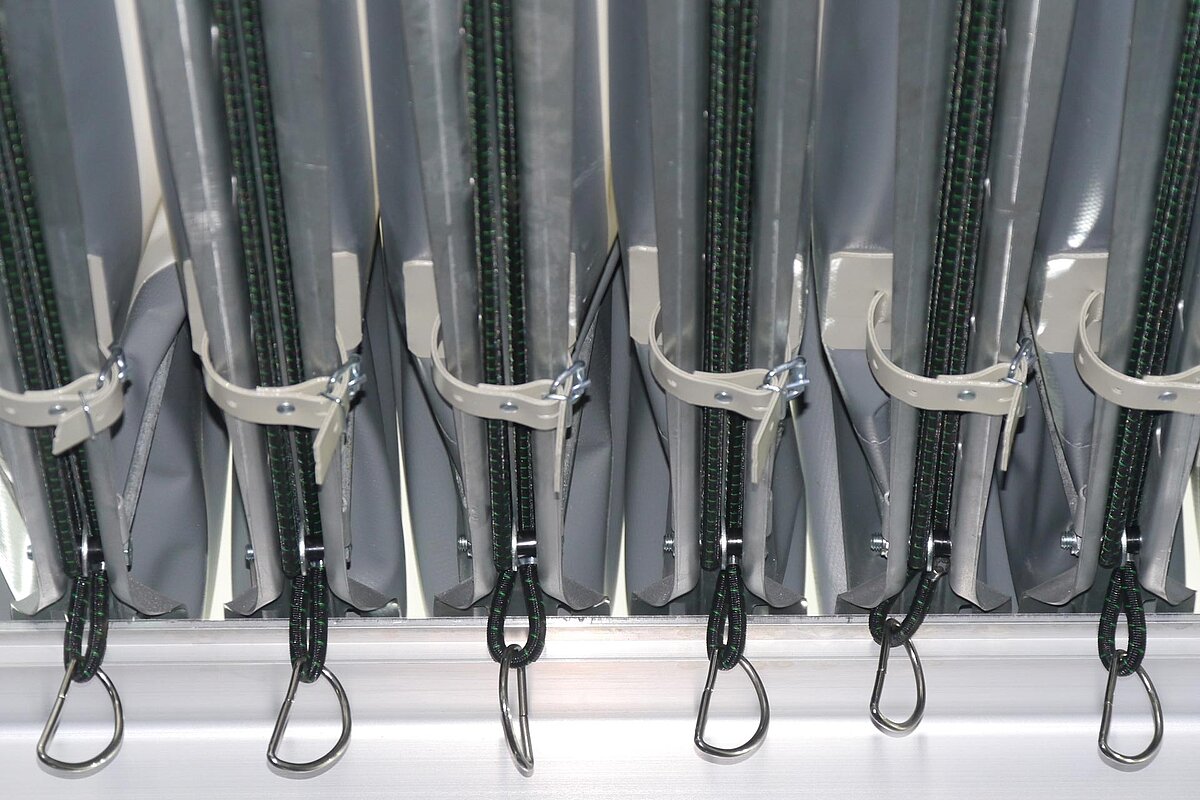 When it comes to load securing, the Fliegl Blitz sliding roof scores on two counts: its integrated locking bar holder and its integrated Fliegl Easy Fix belt lift system provide an all-round carefree package and optimised load securing. The locking bars are simply inserted into the device of the roof crossbar and fixed to the ground - clamped in place, so to speak. They can be moved and thus flexibly positioned.