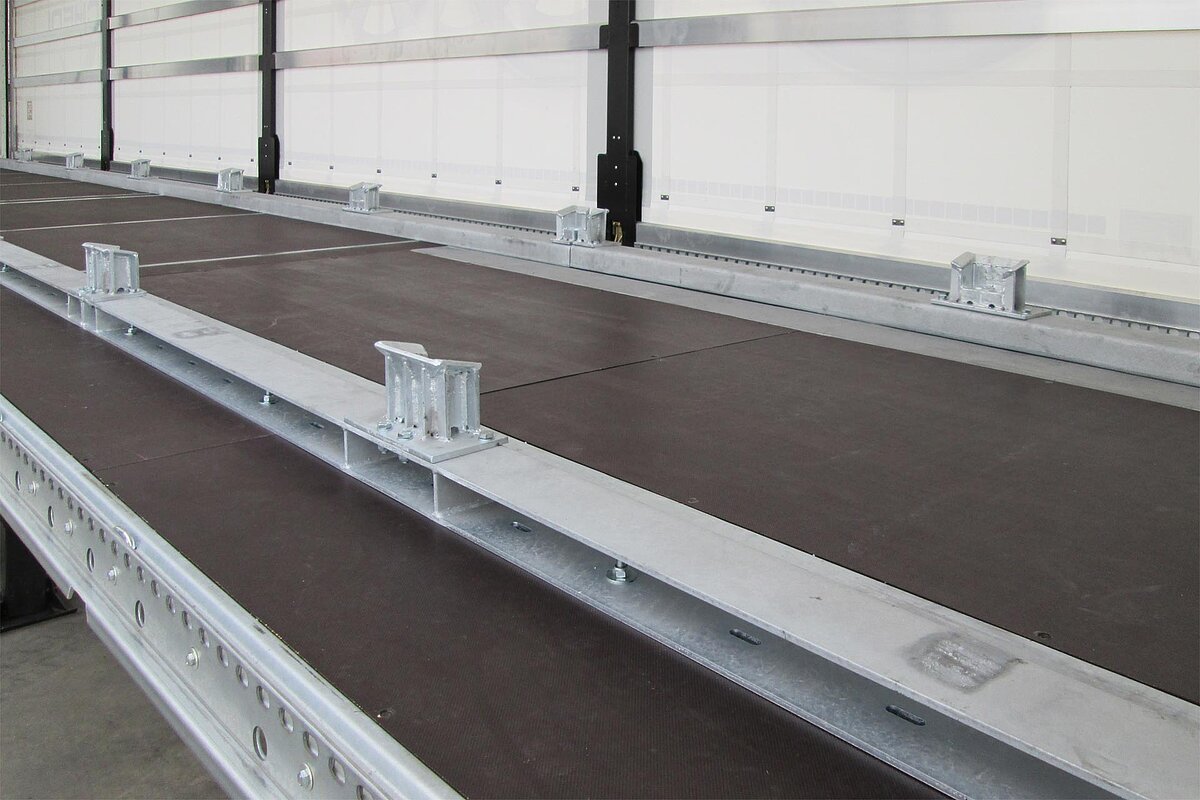 The Vario Wheel rails are mounted on the left and right side over the entire length of the load and are designed for the dimensions of the transport boxes used for transporting tyres and wheels. These are certified according to EN 12642 XL and DC 9.5.