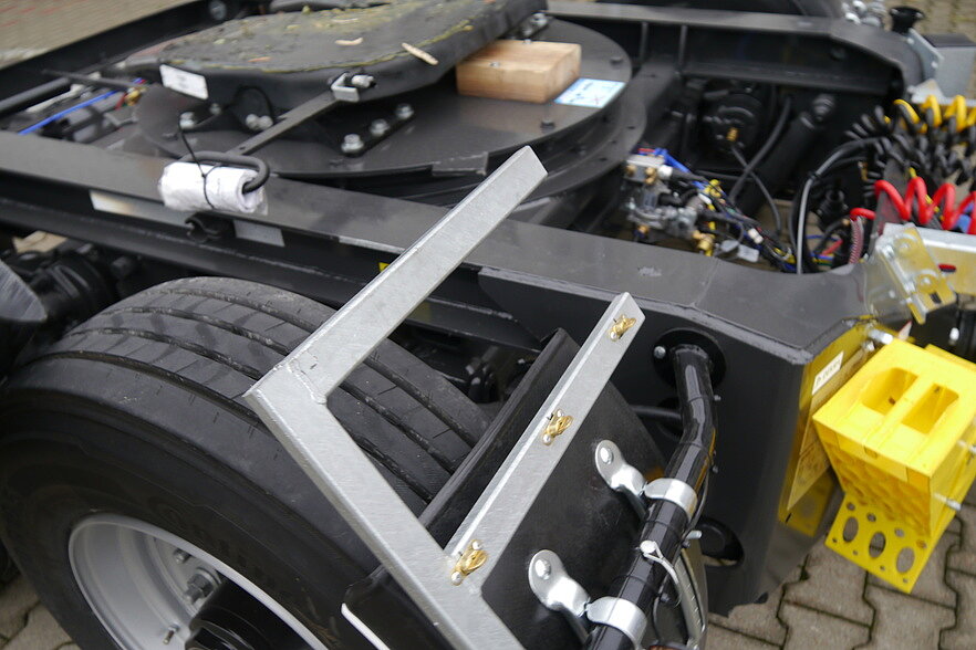 A rigid, under-coupled drawbar establishes the connection to the truck. The drawbar and dolly are combined via another conventional coupling, and a stable slewing ring prevents the trailer from rocking. The CLG dolly runs exactly on the radius of the truck front axle.
