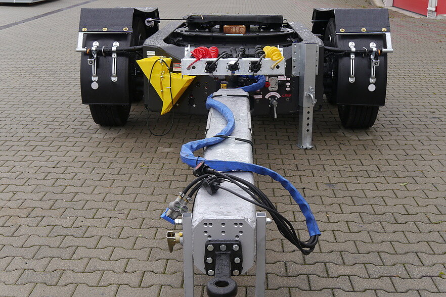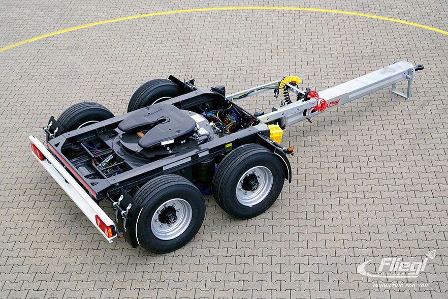 With only 1300 kg it is approx. 50% lighter than other dollies on the market. Flat and compactly designed - with the new steering dolly CLG Fliegl creates a quantum leap in long truck traffic. 920 - 950 mm fifth wheel height stand for themselves and allow compliance with the legal 4-metre height limit.