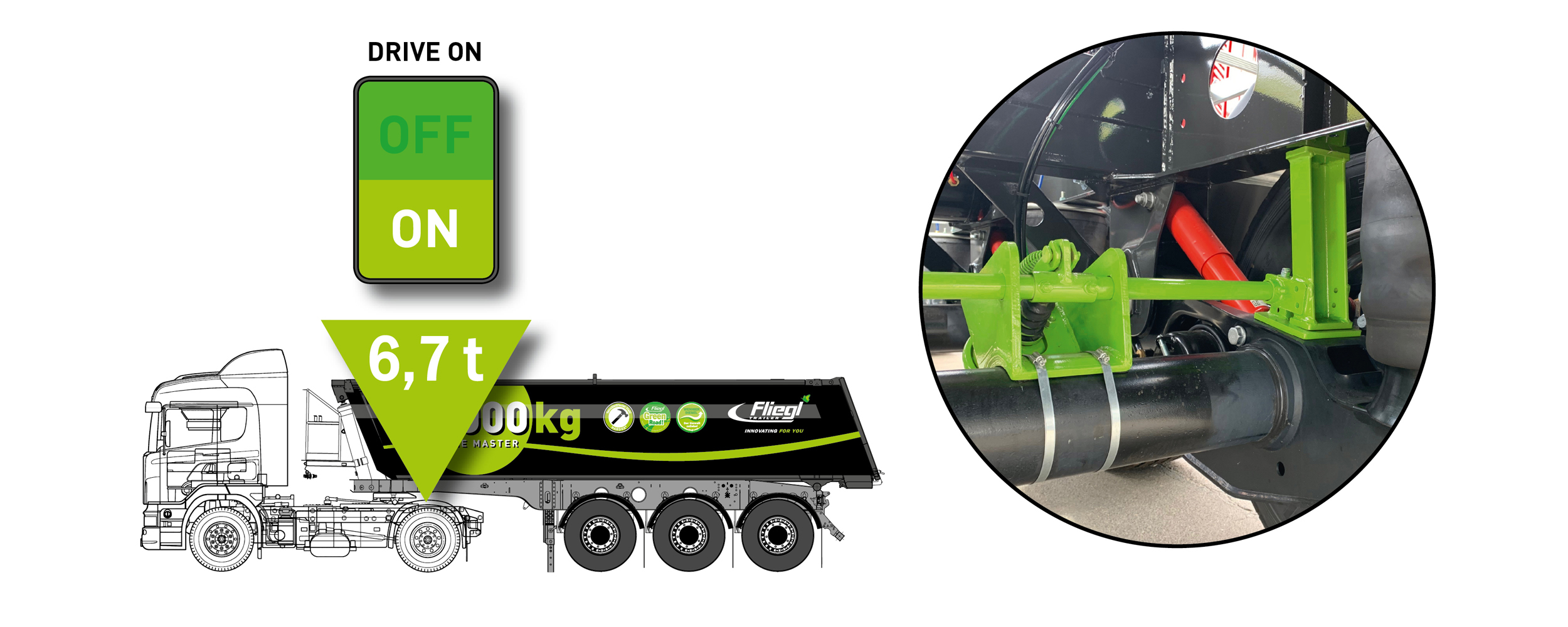 Zusätzlich bietet das System eine Anfahrhilfe. Das kann nützlich sein, wenn die Hinterräder des Lkw auf rutschigem Untergrund wenig oder keinen Grip finden. Beim Dreiachs-Kipper kann die erste Achse angehoben werden, dadurch verlagern sich beim Abkippen 2.800 Kilogramm (10,7 Prozent des Aufliegergewichts) auf die Sattelplatte und sorgen so für mehr Stabilität. Zum Anfahren mit Beladung drücken sogar 6.700 Kilogramm auf die Antriebsachse – mehr Traktion auf losem oder rutschigem Untergrund ist die Folge. Ab einer Geschwindigkeit von 25 km/h senkt sich die erste Achse automatisch wieder ab.