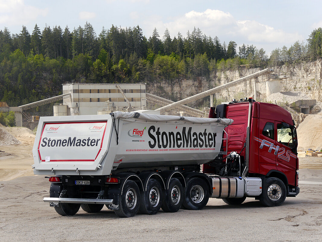 Doch auch seine „Kollegen“ aus Stahl stehen ihm in nichts nach. Die Fliegl StoneMaster werden auf der Bauma sowohl als Zweichser als auch mit dreiachsigem Chassis ausgestellt. Ihre nachhaltige Konstruktion sorgt für ökonomische und ökologische Vorteile – und das von Anfang an. Beide StoneMaster Modelle haben sie - die konisch geformte Mulde aus Original Hardox HB 450. Mit schräger Stirnwand optimal auf das bewährte „Curved“-Chassis abgestimmt. Diese Kombination ermöglicht eine hohe Stabilität und bedeutet gleichzeitig eine hervorragende Gewichtsbilanz. Darüber hinaus ist durch die konische Bauform ein geringerer Kippwinkel erforderlich, um eine optimale Entleerung des Ladeguts zu gewährleisten. Die wannenförmige Mulde ist nur 1.450 mm hoch. Somit wird ein niedriger Schwerpunkt gewährleistet, die geringe Ladehöhe erleichtert die seitliche Beladung und die Oberkante der Mulde überragt nicht die Zugmaschine, was den Verbrauch deutlich minimiert. Diese Sattelkipper sind in erster Linie für den Baustellenbetrieb, im Abbruch und für die Beförderung von Geröll, Schotter und z.B. schweren Fluss-Steinen ausgelegt. Kurze Strecken, hochfrequente Kippzyklen beim extremen Beanspruchen werden vom „Curved“-Chassis gleichermaßen locker weggesteckt wie von der robusten Mulde aus Original Hardox HB 450. Dies bedeutet eine hervorragende Abriebfestigkeit auch bei abrasiven Ladungen und steht gleichzeitig für ein geringes Gewicht. Bei dem ausgestellten Dreiachs-Sattelkipper mit Cramaro-Schiebeverdeck sind die Wände und der Boden durchgehend 4 mm stark, im besonders beanspruchten letzten Drittel ist der Boden 5 mm dick. Außerdem wird im Bereich des Obergurtes das Hardox mit 4 mm Stahl unterfüttert. Dies ergibt einen wirksamen Schutz vor Beschädigungen beim Ladevorgang. Die für Fliegl Trailer typische Membran-Rückwand ist als Pendelklappe ausgeführt und wird mit zwei außen liegenden Haken verriegelt. Falls erforderlich, sorgen zwei zusätzliche Klemmschrauben mit Knebelverschlüssen für eine perfekte Abdichtung der Heckklappe.