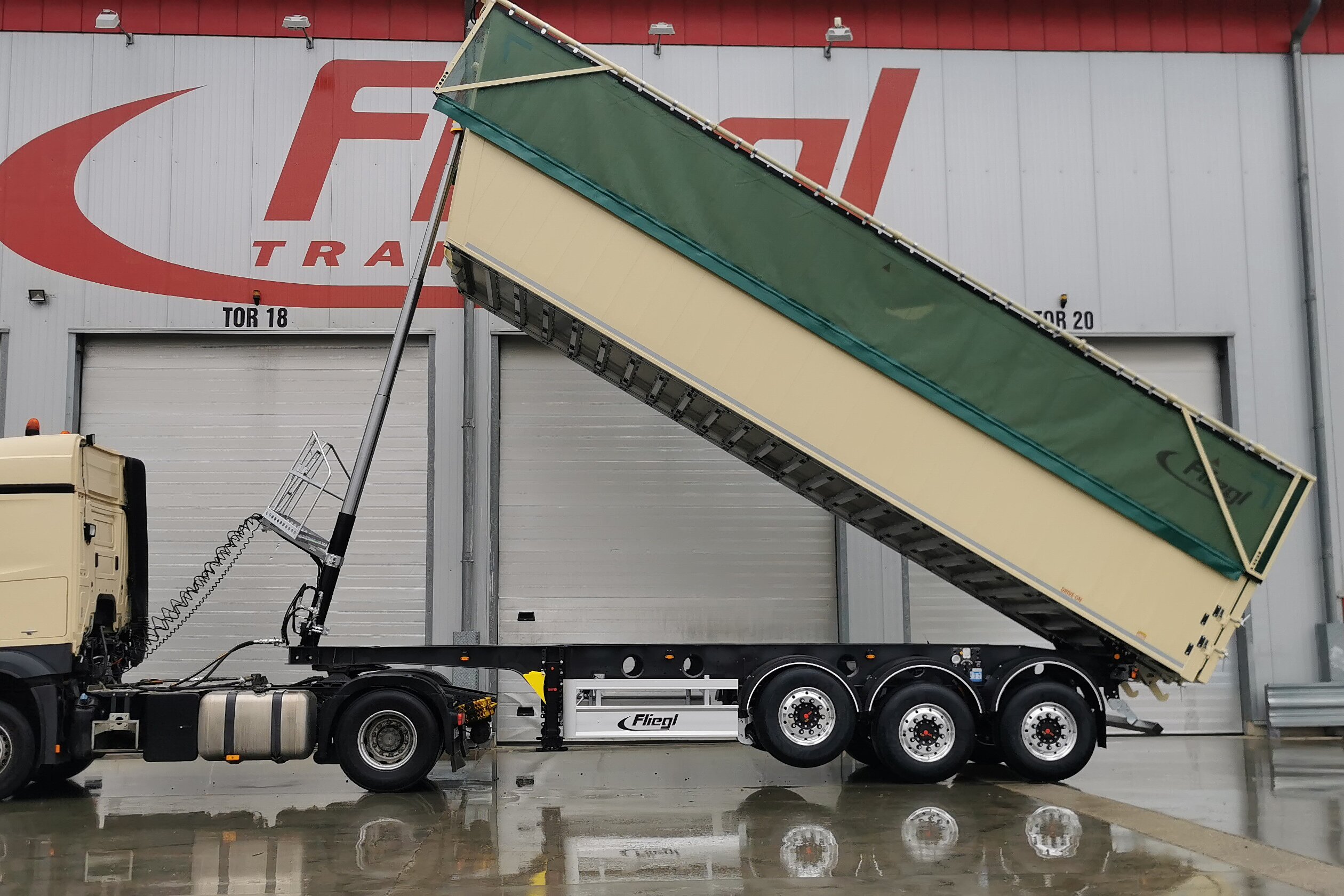 Unternehmer Zirngibl entschied sich für eine ungewöhnliche aber clevere Alternative zum Schiebeverdeck. Fliegl stattete den Trailer mit einem hydraulischen zweiflügeligen Klappverdeck aus, wie es im Agrarbereich öfter zum Einsatz kommt. Der Vorteil: in nur rund 10 Sekunden ist das robuste Netz-Verdeck geöffnet oder geschlossen – schneller geht es kaum. „Beim ersten Trailer mit Klappverdeck im vergangenen Jahr lief der Antrieb noch elektrohydraulisch, für den neuen haben wir uns mit dem Experten von Fliegl auf einen rein hydraulischen Antrieb verständigt. Das klappt super und die Fahrer wollen jetzt am liebsten diesen hier fahren“, berichtet Zirngibl.
