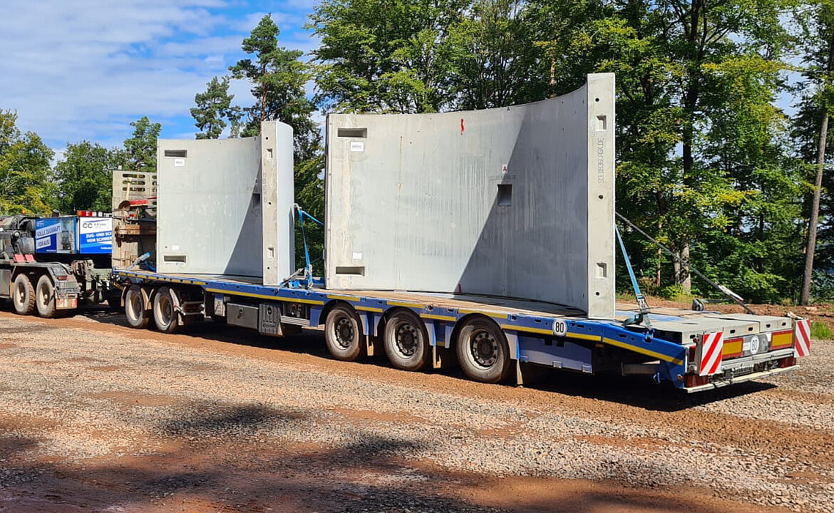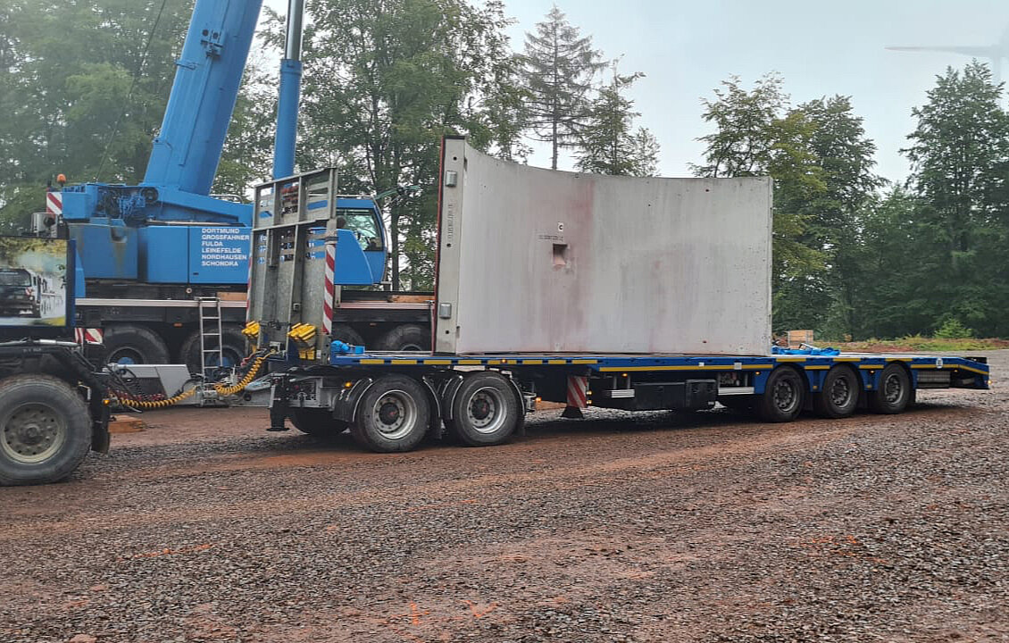 Mit zwei Dollys von Fliegl wickelt CC Bäuml spezielle Transporte ab: „Wir transportieren sehr schwere Teile für Windkraftanlagen, und die müssen teilweise steil bergauf gezogen werden. Selbst mit Schwerlastzugmaschinen kommt man da an Grenzen“, sagt Andreas Michl, bei CC Bäuml verantwortlich für Zughilfen. Die Lösung sind Ex-Bundeswehr-Schwerlasttransporter von Faun, mit 8x8-Antrieb und 950 PS meistern die Trucks fast jede Steigung – mit dem angehängten Fliegl-Dolly und den Bauteilen auf einem Sattelauflieger im Schlepptau. „Fliegl konnte schnell liefern und die Zuggabeln an unsere Bedürfnisse anpassen“, sagt Michl. Der Sonderzugholm ist gekröpft und längenverstellbar, die Leitungen und Kabel sind nicht im Holm verlegt, sondern darunter. Zudem wurde die Sattelplatte nach Kundenwunsch versetzt.