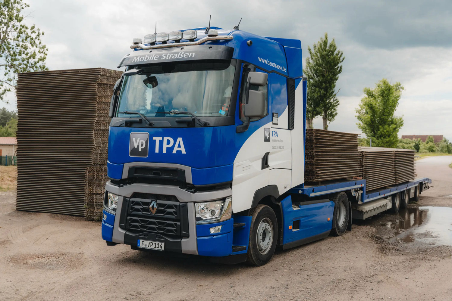 Kürzlich nahm TPA neue Lkw von Volvo in Betrieb. Seit mehreren Jahren setzt das Unternehmen auch auf Fahrzeuge von Fliegl, im Einsatz sind derzeit zwei Plateausattel vom Typ SDS 390 sowie drei Pritschensattelauflieger mit Heckanschrägung vomTyp SDS 410 Jumbo. Thomas Thumulla ist bei TPA verantwortlich für die technische Weiterentwicklung des Fuhrparks, er berichtet: „Besonders wichtig war uns die Ladungssicherung der Platten, daher haben wir sehr viele Rungentaschen und Zurrpunkte an Bord“. Der SDS 410 bietet 12 Rungentaschen im Außenrahmen, davon 4 auf der Kröpfung und 8 im Tiefbett, ergänzt werden sie durch weitere 16 Rungentaschen neben dem Hauptrahmen außen. 20 Zurrpilze mit je 10.000 daN Zugkraft und 20 Zurrösen mit je 5.000 daN Zugkraft bieten jede Menge Verzurrmöglichkeiten. In Verbindung mit Steckrungen und Querbalken können auch Vario-Stirnwände genutzt werden. „Wir haben die Rungenpositionen genau mit dem Verkäufer besprochen, damit es für die verschiedenen Ladungen passt“, berichtet Thumulla. Bei Nichtgebrauch lagern die Steckrungen in einem Staufach an der Stirnwand.