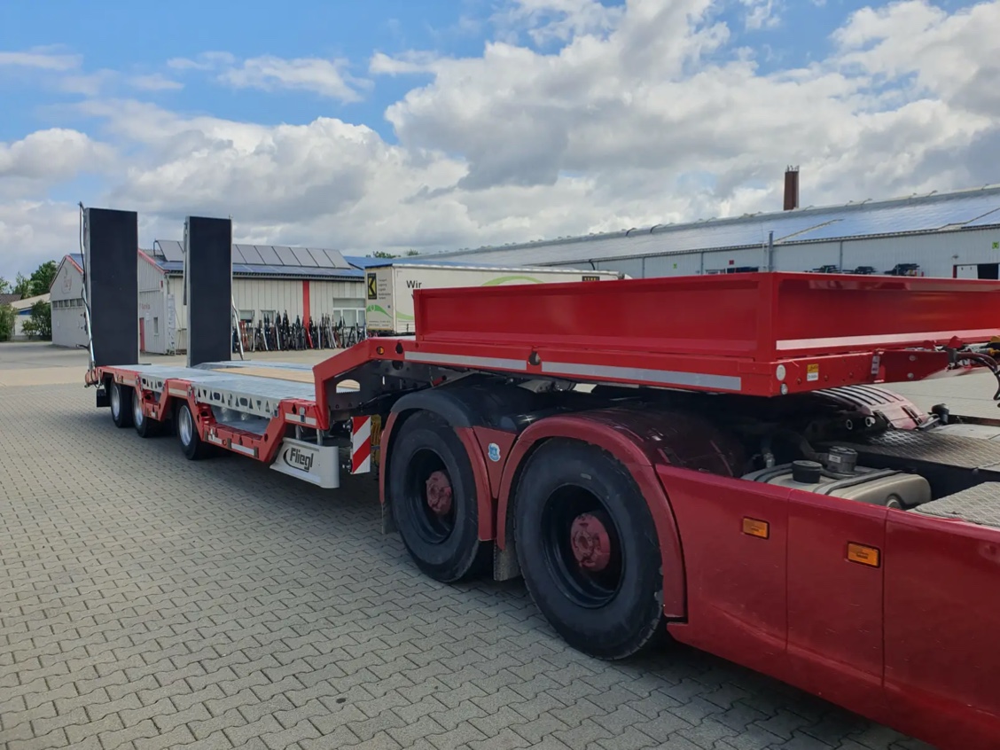 - Tiefladeanhänger mit 3 Achsen auf 13.300 mm Gesamtlänge; Länge Tiefladeplattform inkl. Heckanschrägung 9.100 mm