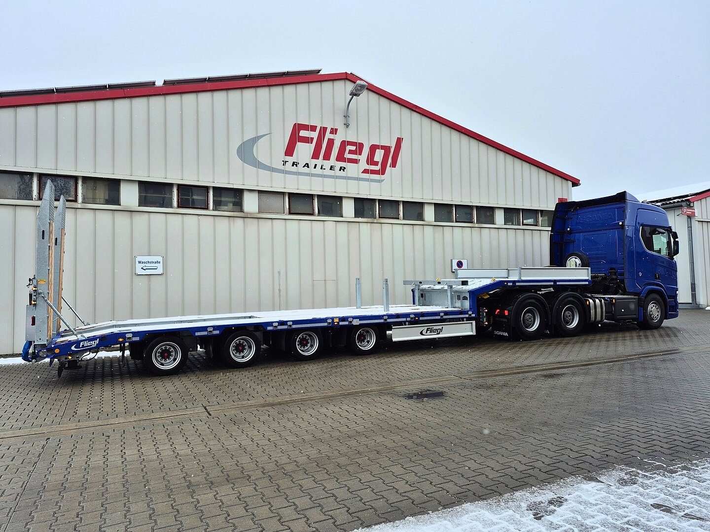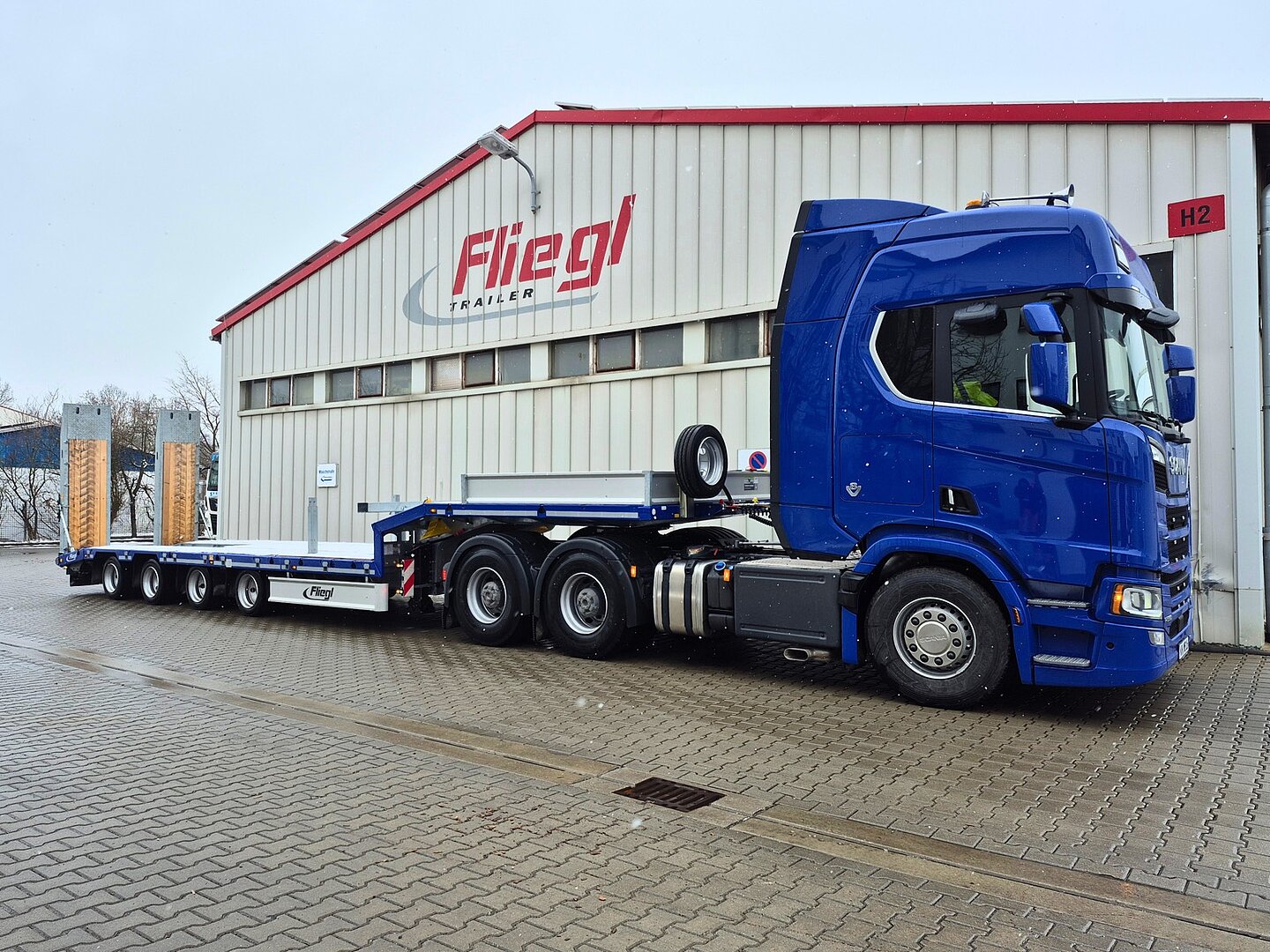 Fliegl legt Ihre Ladung tiefer: Für schwere, hohe oder sperrige Lasten wie Baumaschinen, Anlagenteile oder Betonelemente hat Fliegl diverse Tieflader im Portfolio. Ob Satteltieflader oder Tiefladeanhänger – dank 30 Jahren Erfahrung im Trailer-Bau sind alle Fliegl-Fahrzeuge optimal für den harten Transportalltag ausgerüstet. Das beginnt bei diversen Rampenausführungen: Ob einteilig oder zweigeteilt, lang oder kurz, mit Holz oder Metallgittern belegt, gerade oder mit Heckanschrägung – Fliegl bietet für jeden Einsatzzweck die optimale Rampe; auf Wunsch hydraulisch heb-, senk- sowie seitlich verschiebbar. Auf dem Boden sorgt robustes Holz mit 70 Millimeter Stärke für Grip und Standfestigkeit. Die Verlegung mit Spalt zwischen den Bohlen sorgt dafür, dass das Holz schneller wieder trocknet und so länger hält.